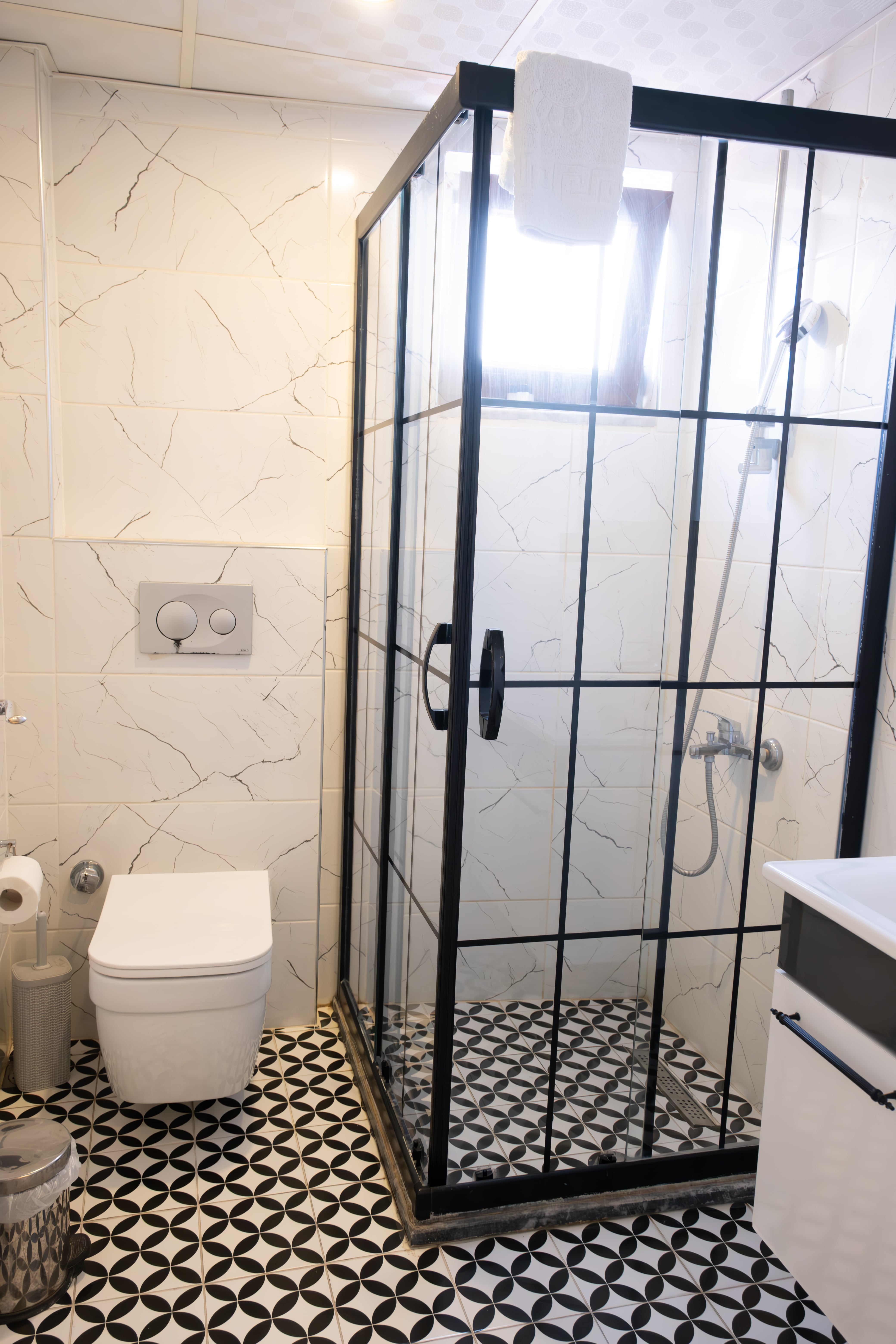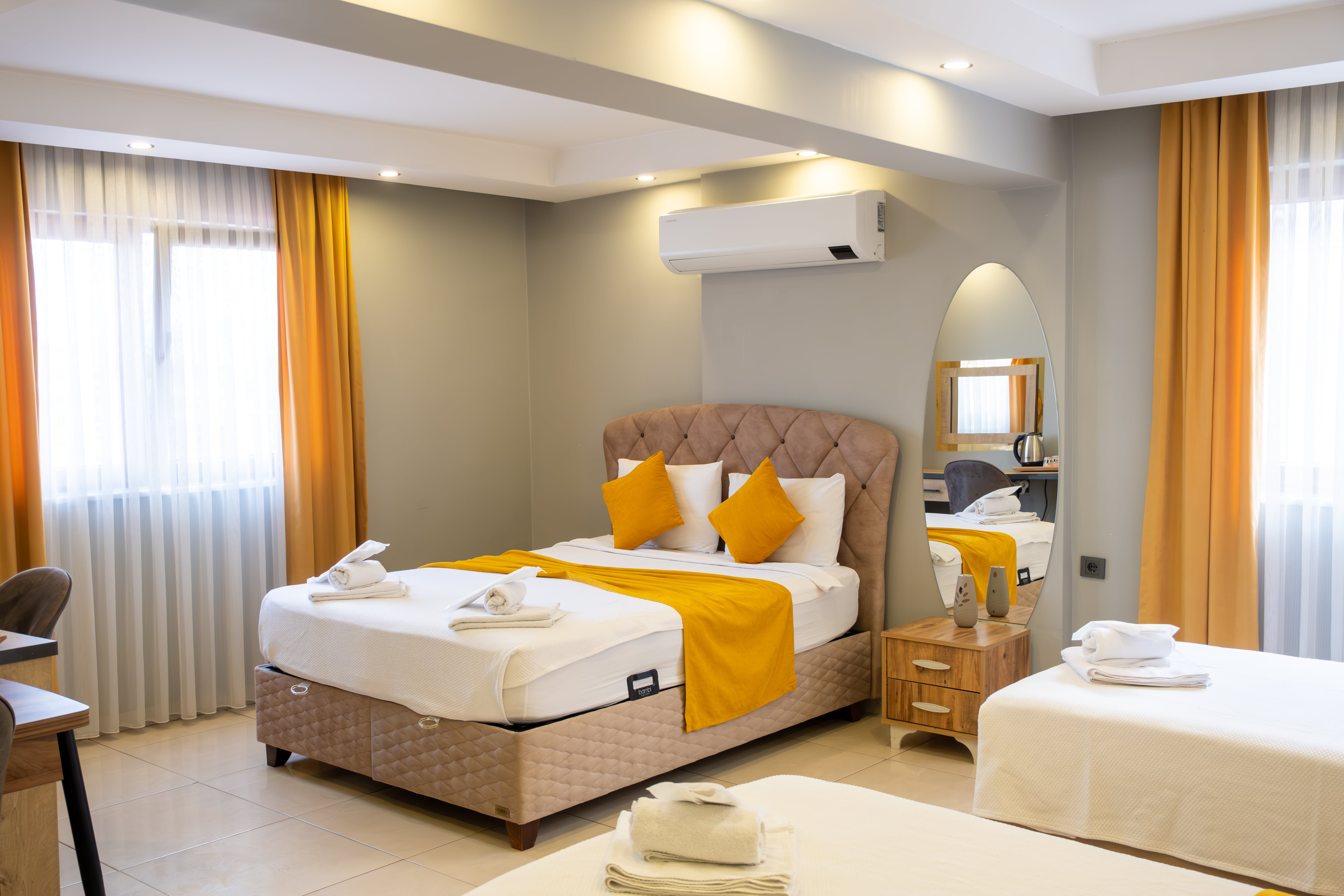 * Duşa kabin, saç kurutma makinesi, makyaj aynası, bornoz ve terlik.